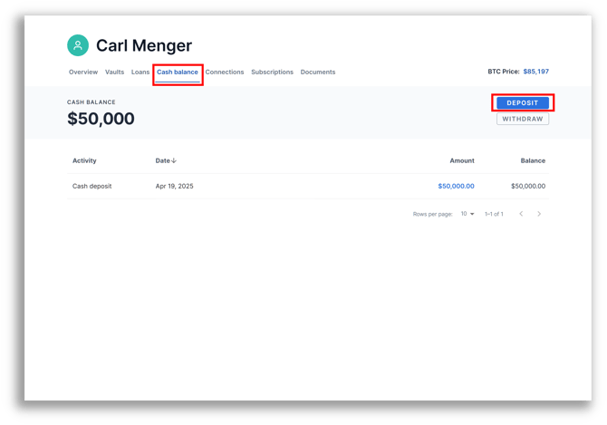 To fund your Cash Balance, select the account you want to add cash to and navigate to Cash balance on the top navigation bar.