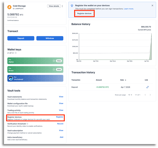 - Vaults: Click Register devices from the Vault tools section or the banner at the top of your screen.