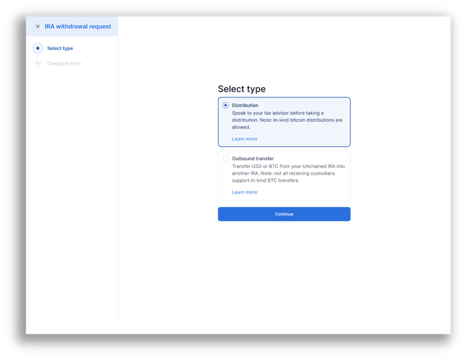 To initiate an IRA distribution, you must complete an IRA distribution request form within the Unchained platform. Cash distributions are taken from your IRA cash balance, and you may need to sell bitcoin to increase your cash position. Selling bitcoin will require your keys. In-kind bitcoin distributions also require signatures from your keys.