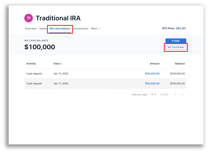 - Ensure that your intended withdrawal amount is reflected in your cash balance. You can sell bitcoin from your IRA vault to increase your available balance.