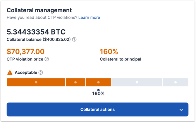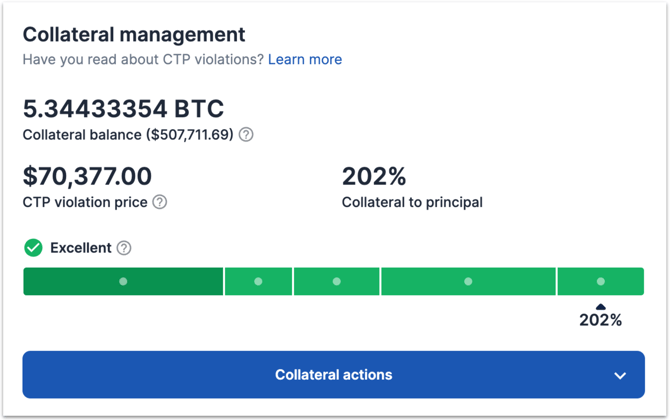 There are three primary sections of the Collateral management card: Collateral balance, CTP violation price, and Collateral to principal.